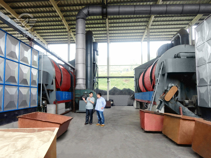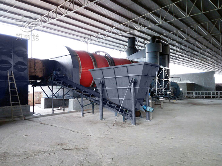 其工藝流程:熱風(fēng)爐是產(chǎn)生熱能的場(chǎng)所。將燃料加入熱風(fēng)爐中,通過(guò)燃燒產(chǎn)生高溫?zé)峤橘|(zhì),為烘干機(jī)主體提供連續(xù)穩(wěn)定的熱量。然后再由上料裝置(皮帶運(yùn)輸機(jī)、密封刮板輸送機(jī)或螺旋輸送機(jī))均勻連續(xù)的將物料送入烘干機(jī)內(nèi)部。物料與高溫?zé)峤橘|(zhì)在筒體內(nèi)部進(jìn)行熱交換,從而將物料中的水分蒸發(fā)出來(lái),實(shí)現(xiàn)物料從高濕高粘轉(zhuǎn)變?yōu)椴粷癫徽?。達(dá)到烘干要求的物料,經(jīng)過(guò)出料裝置運(yùn)送出來(lái)進(jìn)行統(tǒng)一打包、裝載。而在烘干過(guò)程中產(chǎn)生的煙氣、粉塵等氣體,通過(guò)引風(fēng)機(jī)將其輸送至除塵設(shè)備當(dāng)中進(jìn)行凈化、過(guò)濾、降塵,實(shí)現(xiàn)氣體的達(dá)標(biāo)排放。整個(gè)烘干生產(chǎn)線一體化聯(lián)動(dòng),共同完成物料的烘干。